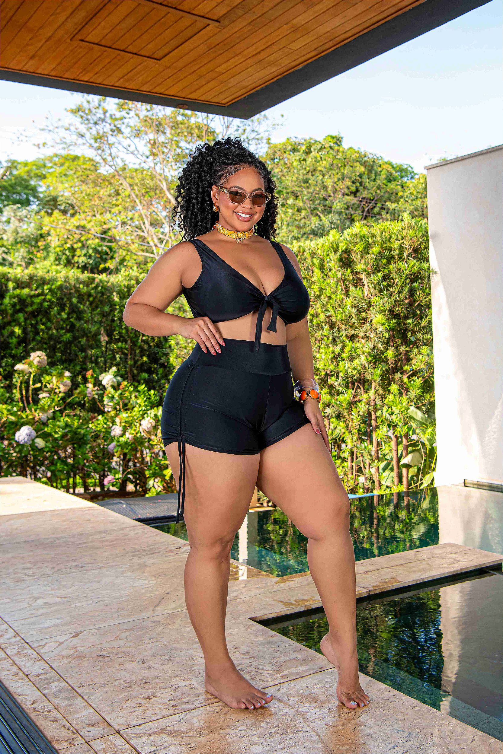 Um biquíni com proposta diferente e cheia de personalidade. A calcinha tradicional dá lugar a um shortinho forrado, com cós alto e modelagem especial que valoriza o corpo. Nas laterais, os franzidos com regulagem permitem ajustar o comprimento, deixando a peça mais curta ou mais alongada, conforme o gosto da cliente. Por ter forro completo, o short dispensa o uso de calcinha por baixo, sendo uma opção prática e mais fechada.